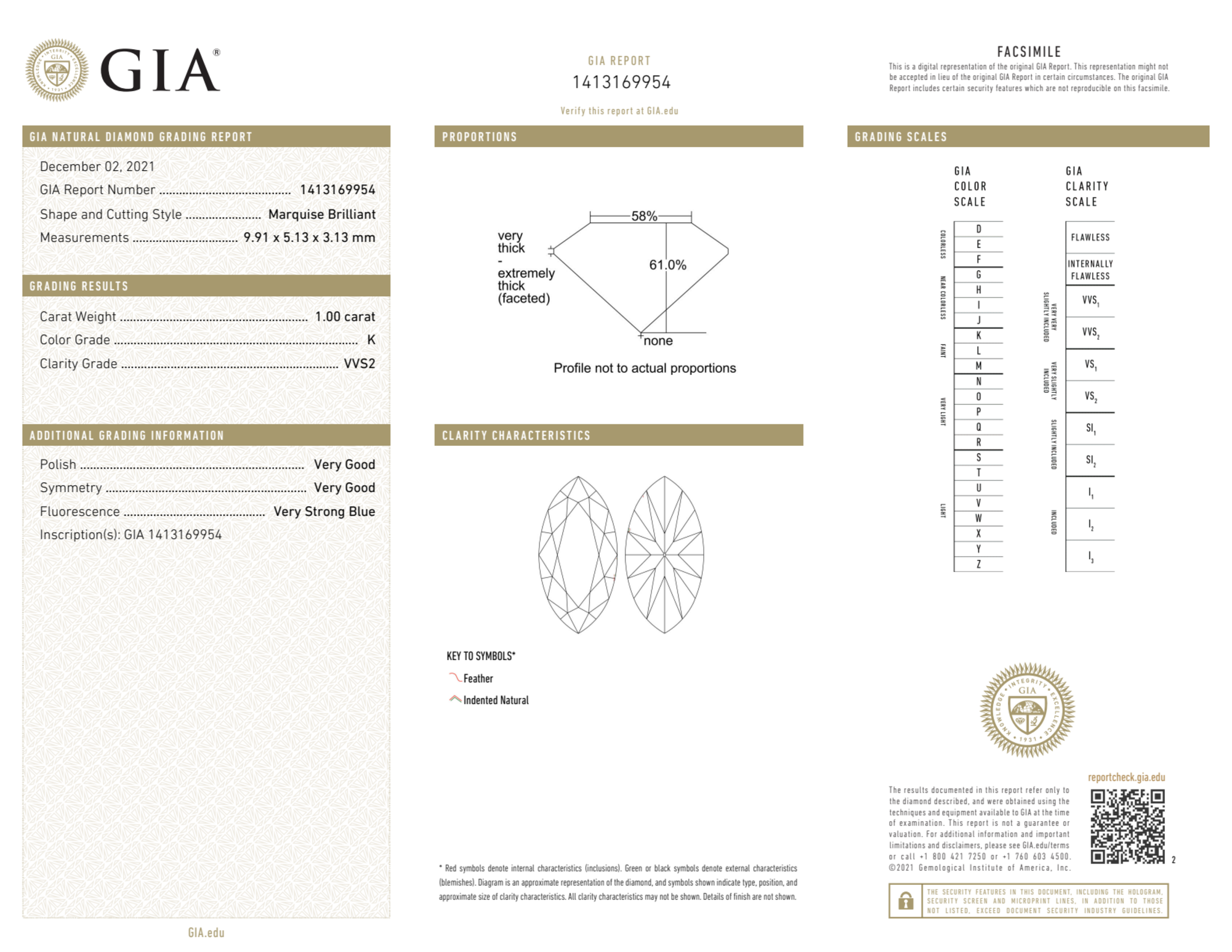 Your 1.00 carat Marquise natural diamond is graded VVS2 clarity, which stands for Very Very Slightly Included 2. Read more about VVS2 clarity diamonds here, or learn more about diamond clarity in general here.