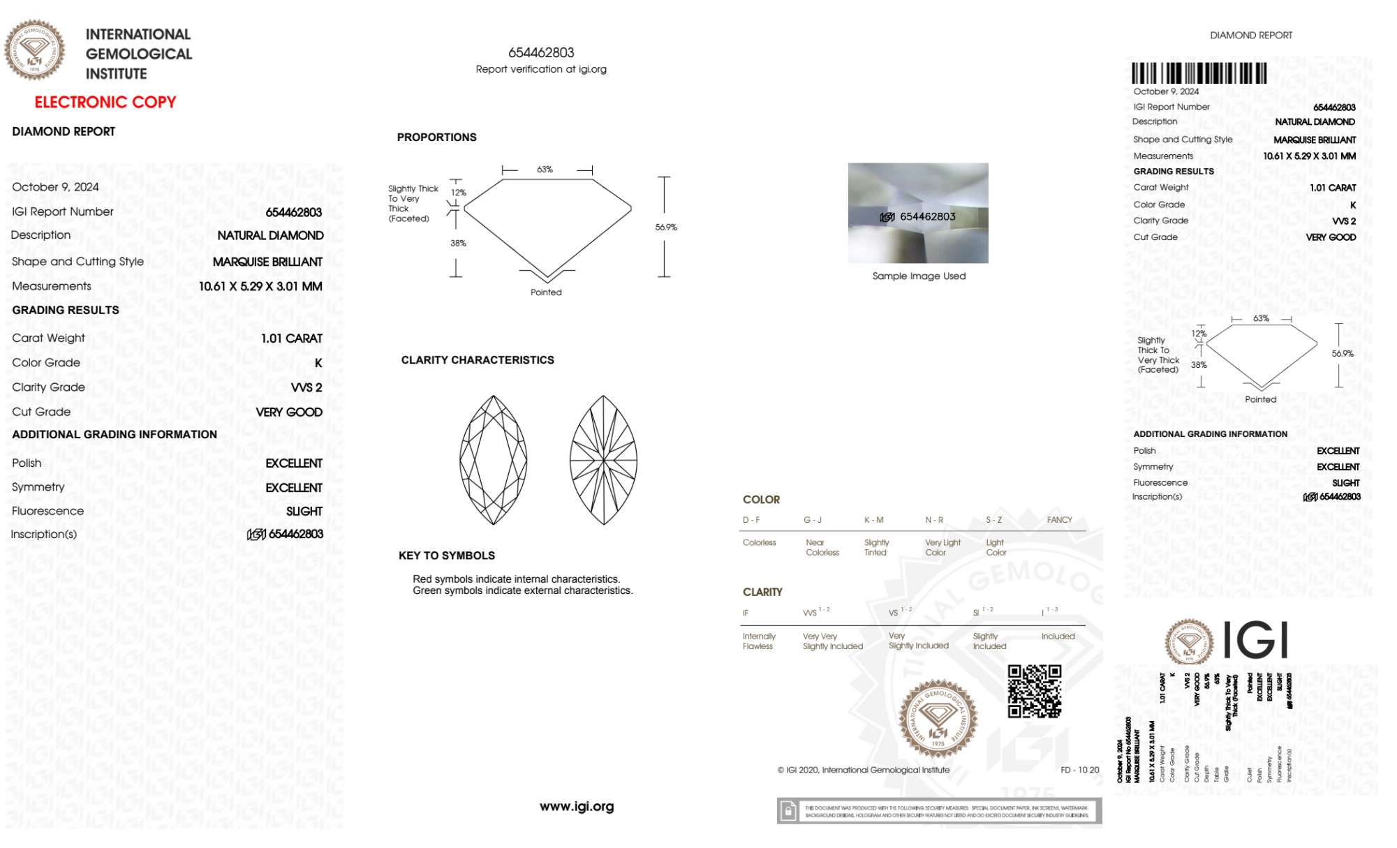 Your 1.01 carat Marquise natural diamond is graded K color (Faint Color), and you can read more about K color diamonds here.