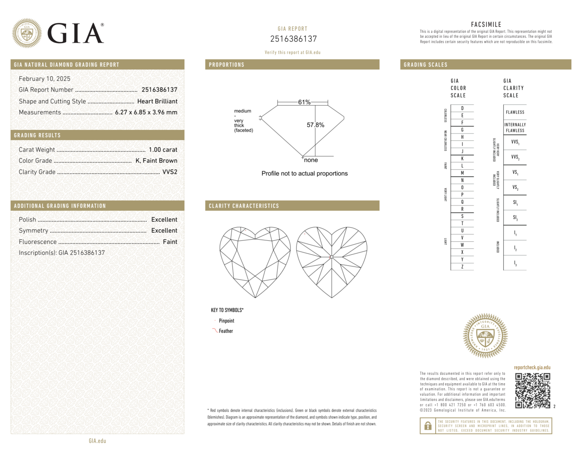 Your 1.00 carat Heart natural diamond is graded K color (Faint Color), and you can read more about K color diamonds here.