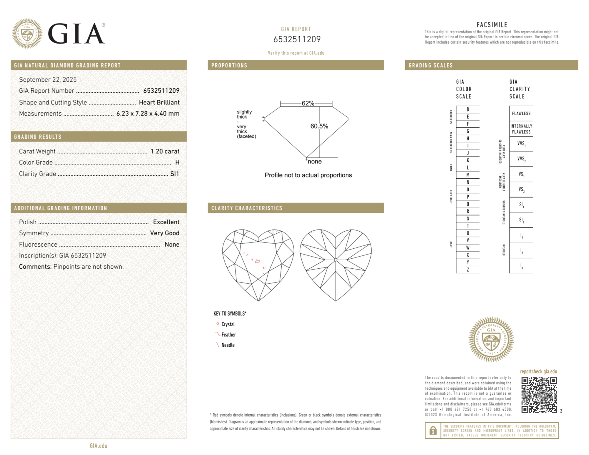 Your 1.20 carat Heart natural diamond is graded H color (Near Colorless), and you can read more about H color diamonds here.